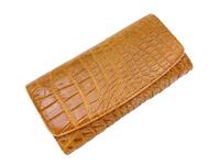 For manufacturing of this wallet were use high quality, soft and elastic genuine Siamese Crocodile leather. Used smoth and knee part of crocodile skin. Wallet consist from two banknotes compartments, eleven card slots, one slot for ID card with transparent window, one flat zip pocket located behind banknotes compartment, two flat compartment located behind zip pocket and two extra flat pocket located behind the raw on card slots. Calfskin and textile were using as a lining material. One fold of wallet closing on strap with button, another fold of wallet closing on magnet button.