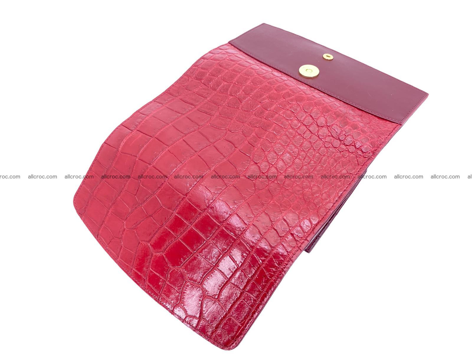 For manufacturing of this wallet were use high quality, soft and elastic genuine Siamese Crocodile leather. Used belly part of crocodile skin, wallet made from one whole piece of crocodile skin what increasing valuable of this wallet. Wallet consist from two banknotes compartments, eleven card slots, one slot for ID card with transparent window, one flat zip pocket located behind banknotes compartment, two flat compartment located behind zip pocket and two extra flat pocket located behind the raw on card slots. Calfskin and textile were using as a lining material. One fold of wallet closing on strap with button, another fold of wallet closing on magnet button.
