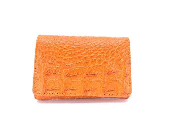 Genuine crocodile skin wallet trifold model mini with coins compartment. For manufacturing of this wallet used genuine Siamese crocodile skin, used High-end manufactured crocodile leather. Using part of hide: - side part and knee of hide of Siamese crocodile hide skin soft and gentle. Wallets of this model targeted for women. On front side of wallet we can see nice texture of side of crocodile hide what becomes to the knee part on back side of wallet. Joint of skin glued very professionally and joint is almost invisible.