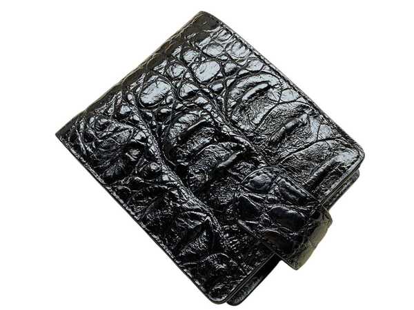 Classical crocodile skin wallet trifold for women, wallet equipped compartment for coins. For manufacturing of this wallet were used high quality genuine crocodile leather of Siamese crocodile, smooth and knee part of crocodile skin. Wallets of this model has a good functionality and will be loved by those of you who prefer wallets of average size that can be carried in even in small handbag. Wallet consist from one banknotes compartment, eight card slots, one ID slot with transparent window, one pocket for coins and fife extra side pockets. Wallet closing on the magnet button. Calfskin and textile used as a lining material.