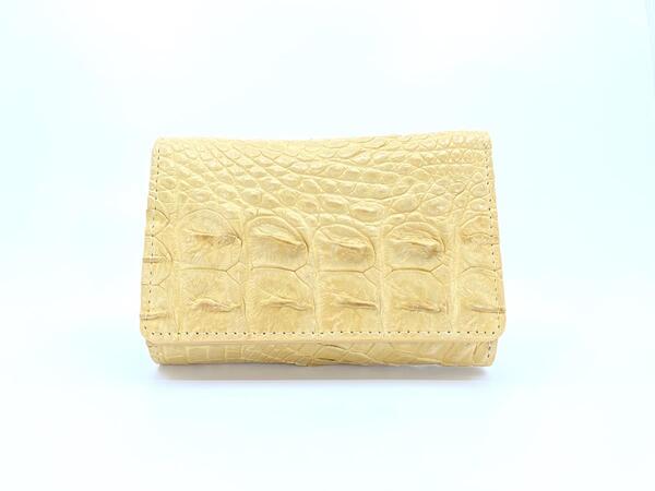 Classical crocodile skin wallet trifold for women, wallet equipped compartment for coins. For manufacturing of this wallet were used high quality genuine crocodile leather of Siamese crocodile, smooth and knee part of crocodile skin. Wallets of this model has a good functionality and will be loved by those of you who prefer wallets of average size that can be carried in even in small handbag. Wallet consist from one banknotes compartment, eight card slots, one ID slot with transparent window, one pocket for coins and fife extra side pockets. Wallet closing on the magnet button. Calfskin and textile used as a lining material.