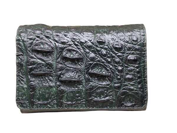 Classical crocodile skin wallet trifold for women, wallet equipped compartment for coins. For manufacturing of this wallet were used high quality genuine crocodile leather of Siamese crocodile, smooth and knee part of crocodile skin. Wallets of this model has a good functionality and will be loved by those of you who prefer wallets of average size that can be carried in even in small handbag. Wallet consist from one banknotes compartment, eight card slots, one ID slot with transparent window, one pocket for coins and fife extra side pockets. Wallet closing on the magnet button. Calfskin and textile used as a lining material.