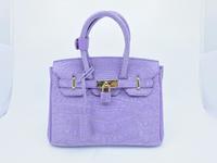 Women’s crocodile skin handbag made from belly part of Siamese crocodile skin. Prototype of this bag is famous Hermes Birkin. This bag is not copy or replica of Birkin. As main decoration of this bag is belt from crocodile skin around the top of bag which crowned by lock. All parts of this bag made from crocodile skin, main surface, back part, side parts, bottom part, handles, and long shoulder belt, all of those parts made from crocodile skin. Bag inside made in one volume, inside has one flat pocket. Calfskin used as lining material. Detachable shoulder belt with crocodile skin facing at set.