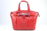 Bag for women from genuine crocodile leather. This bag is made from real crocodile, hide of Caiman crocodile. This bag is medium size. This bag will be like by ladies who like to wear bag in arm or forearm or on shoulder. Adjustable length shoulder belt with facing of crocodile skin - at set. On front surface of bag we see textured part of nape of caiman hide. Back side of bag has a texture of hornback of hide of caiman crocodile. Handles of bag made with crocodile skin. As an additional ornamentation of bag, on front surface located decorative strap with lock and key. On the top of bag sewed metal zip, using of steel zipper prolongs the service life of bag. Interior of bag made from genuine cow leather colored under the color of the bag. Bag inside created in one volume, there are two comfortable pockets for keys and other essential goods.