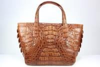 Bag for women from genuine crocodile leather. This bag is made from real crocodile, hide of Caiman crocodile. This bag is medium size. This bag will be like by ladies who like to wear bag in arm or forearm or on shoulder. Adjustable length shoulder belt with facing of crocodile skin - at set. On front surface of bag we see textured part of nape and part of hornback of hide of caiman. Back side of bag has a texture of hornback of hide of caiman crocodile. Handles of bag made with crocodile and cow skin. On the top of bag sewed metal zip, using of steel zipper prolongs the service life of bag. Interior of bag made from genuine cow leather colored under the color of the bag. Bag inside created in one volume, there are two comfortable pockets for keys and other essential goods.