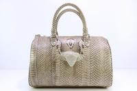 Handbag for lady made from genuine cobra leather with cobra head. Handbag made like a gripsack or valise. For manufacturing of this bags used genuine hides of cobra, natural color. As the main decoration of bag on front surface of bag located genuine head of cobra. At the top of handbag located zipper. Inner of bag made from cloth. The bag is made in one volume. Inside of bag are two pockets, with zipper and flat pocket.