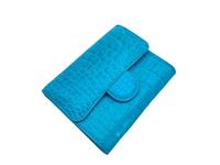 This is new model of women’s wallet, trifold wallet from Siamese crocodile leather. Wallets of this model will be loved those of you who prefer wallets of average sizes. For manufacturing of this wallet used belly part of crocodile skin. Skin soft and elastic. On main surface located flap with button. Wallet consist from one banknotes compartment, six cards slots, and extra four pockets. Calfskin and textile used for lining material
