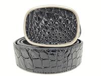 Handcrafted crocodile leather belt made from genuine Siamese crocodile skin, smooth part of crocodile knee. This belt made from genuine Siamese crocodile skin soft and supple used crocodile leather has a large cell texture and pattern of skin of crocodile knee. The top surface of the belt made from crocodile skin, the skin is glued together from few pieces, but gluing of skin made very professionally and almost invisible. As a base for this belts used genuine cow skin. This handcrafted crocodile belt can be used both men and women, but mainly this model targeted for men. Belt equipped rectangular shape buckle with rounded corners antique silver color with decoration from crocodile skin on main surface, what fixing to the belt through crocodile leather strap half belt.