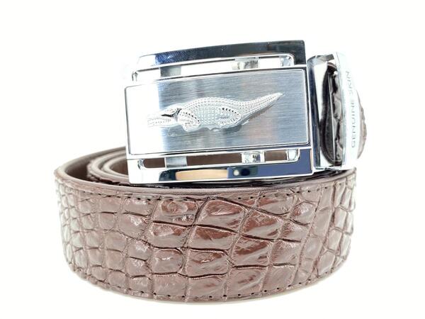 Handcrafted crocodile leather belt made from genuine Siamese crocodile skin, smooth part of crocodile knee. This belt made from genuine Siamese crocodile skin soft and supple used crocodile leather has a small cell texture and pattern of skin of crocodile knee. The top surface of the belt made from crocodile skin, the skin is glued together from few pieces, but gluing of skin made very professionally and almost invisible. As a base for this belts used genuine cow skin. This handcrafted crocodile belt can be used both men and women, but mainly this model targeted for men. Belt equipped buckle in the form of a crocodile fixing to the belt through crocodile leather strap half belt.