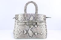 Handbag for lady, copy of Birkin made from genuine python skin. I draw your attention this is mini copy, without any tags, icons and labels of Hermes. For manufacturing of this bags used genuine hides of python back part, with natural pattern of skin. This model of bags will be liked by ladies who prefer bags with small size. On the front and back surfaces of python handbag we can clearly see unique texture of back of python hide. As the main decoration of bag, on the front surface of the bag, we see decorative strap and lock. At the top of handbag located zipper. Inner of bag made from cloth. The bag is made in one volume. Inside of bag are two pockets, with zipper and flat pocket.