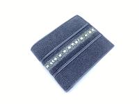 Genuine row stone stingray skin wallet. This wallet is a classical stingray wallet. As a main decoration on both sides of wallet, we can clearly see white row, this is back part of stingray row stone. Inside of wallet arranged 2 banknotes compartments, 6 compartments for cards, 2 compartments with transparent windows 4 side pockets. Lining material is cow skin and textile.