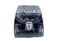 Crocodile skin shoulder bag with flap. For manufacturing of this bag use genuine crocodile leather. We use black color tail part of crocodile hide. On main surface has flap with lock. On the main surface of bag and on the backside we can clearly see unique texture of crocodile tail. Side parts of bag manufactured from soft calfskin black color. Shoulder bag equipped detachable shoulder belt from calfskin. Bag inside has small zip pocket, as a lining material use smooth cloth black color.