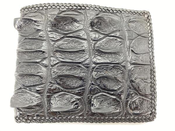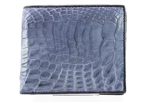 Classical crocodile skin wallet, standard short bifold wallet. For manufacturing of this wallet used genuine Siamese crocodile skin, skin high quality, soft and elastic. This wallet made from tail part of crocodile skin of young crocodile. Wallet consist from – two banknotes compartments, six card slots and four side pockets with assess from middle part of wallet. Soft calfskin and textile used for lining material.
