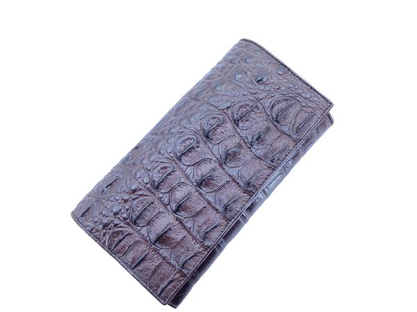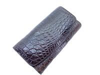 Handcrafted crocodile skin long wallet trifold for women. For manufacturing of this wallet used genuine Siamese crocodile skin, smooth leg part. Crocodile skin soft and elastic, high quality dressing skin. On backside of wallet located convenience flat pocket. Inside wallet, consist from two banknotes compartments, one flat zip pocket behind banknotes compartments and one flat pocket behind zip pocket. Thirteen card slots, two flat pocket located under the card slot row, one of this card slot has a transparent window. One fold of wallet closing on strap with button. Another one fold closing on the magnet button. Textile and soft calfskin used as a lining material.