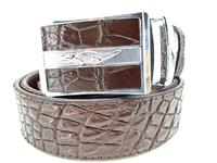 Crocodile leather belt made from genuine Siamese crocodile skin, smooth part of crocodile knee. This belt made from genuine Siamese crocodile skin soft and supple. The top surface of the belt made from crocodile skin, the skin is glued together from few pieces, but gluing of skin made very professionally and almost invisible. As a base of belt used genuine cow skin. Belt equipped steel automatic buckle with crocodile shield on the middle of buckle and two crocodile skin strips.