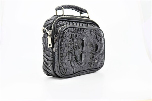 Clutch from crocodile skin for lady. Crocodile skin purse for lade made from genuine Siamese crocodile skin. Purse of this model has a detachable shoulder belt (metal chain) and can be used as a small handbag and as a shoulder bag. On the top of purse has a zip. Purse made in one volume. For manufacturing of purse of this model used genuine Siamese crocodile leather, tail part with a unique texture.