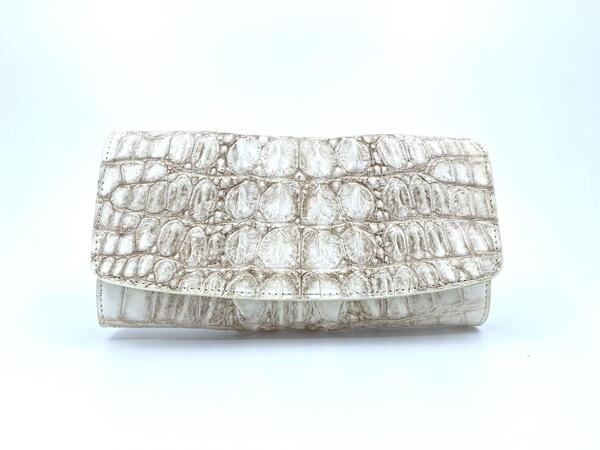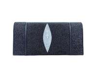 Genuine stingray skin long wallet - trifold for lady. For manufacturing of wallets of this model used genuine skin of stingray. High-end leather manufactured. Wallets of this model will be liked to those ladies who prefer wallets of average size with good capacity. On main surface of wallet we see one white eye typical for stingray goods ornamentation. On back surface of wallet on the top located one convenient flat wide pocket.