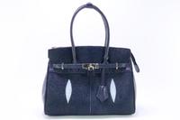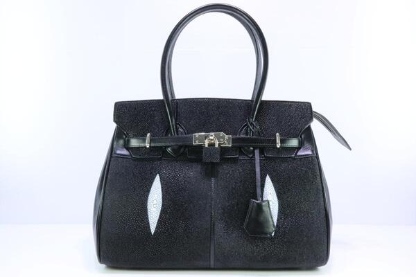 For manufacturing of this handbags used high-end manufactured genuine stingray leather. Handbag of this model will appeal to those women who prefer handbags of average size with good capacity. Model of this handbag made looks like famous handbag from Hermes Birkin. As a main decoration of this handbag on main and back surfaces used valve made from genuine stingray skin and decorative belt-strap around whole handbag with lock decorated by stingray skin. On main and back surfaces of this handbag we can clearly see white eyes this is typical ornamentation of goods from stingray skin. Handbag inside made from one volume. On inner sides of handbag located pockets 2 pockets one with zipper and 1 pocket without zipper. For greater flexibility and elasticity sides parts are made from soft calfskin. Lining material is soft cloth.
