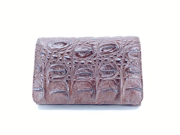 Women’s wallet trifold medium size made from crocodile leather for manufacturing of wallets of this model used genuine Siamese crocodile skin. Used crocodile skin is soft and supple. This wallet made from one whole piece of crocodile skin that makes his value up. As a main decoration on front surface of wallet we can see hornback texture and unique patter of Siamese crocodile skin, on back side texture and pattern changing into the belly part of crocodile skin. Wallets of this model have a middle size and good capacity, this characteristic makes this wallet one of most popular models.